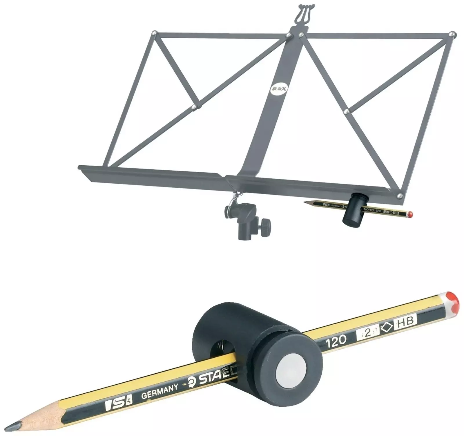 Handy little pencil holder for your music stand (or any other magnetic surface). Perfect for orchestra or during lessons. Have your pencil immediately within reach.